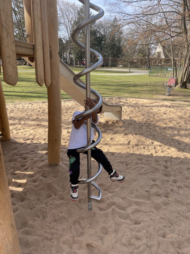 Bei strahlendem Sonnenschein besuchten die Kinder und ihre Begleiterinnen zum ersten Mal den neuen Spielplatz im Ortszentrum von Pullach. Alles glänzte noch frisch: die bunte